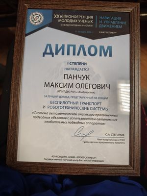 За лучший доклад, представленный на секции «Беспилотный транспорт и робототехнические системы» дипломом 1 степени награжден младший научный сотрудник, аспирант 2 года обучения ИПМТ ДВО РАН Панчук Максим Олегович, дипломом 2 степени награжден научный сотрудник, аспирант ДВФУ Юрманов Александр Павлович. За лучший доклад, представленный на секции «Прикладные задачи навигации и управления движением» дипломом 2 степени награжден младший научный сотрудник Григорьев Иван Максимович. |