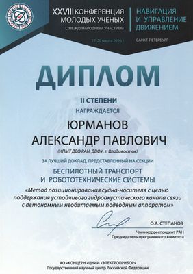 • А.П. Юрманов, Д.В. Копылов. Метод позиционирования судна-носителя с целью поддержания устойчивого гидроакустического канала связи с автономным необитаемым подводным аппаратом;